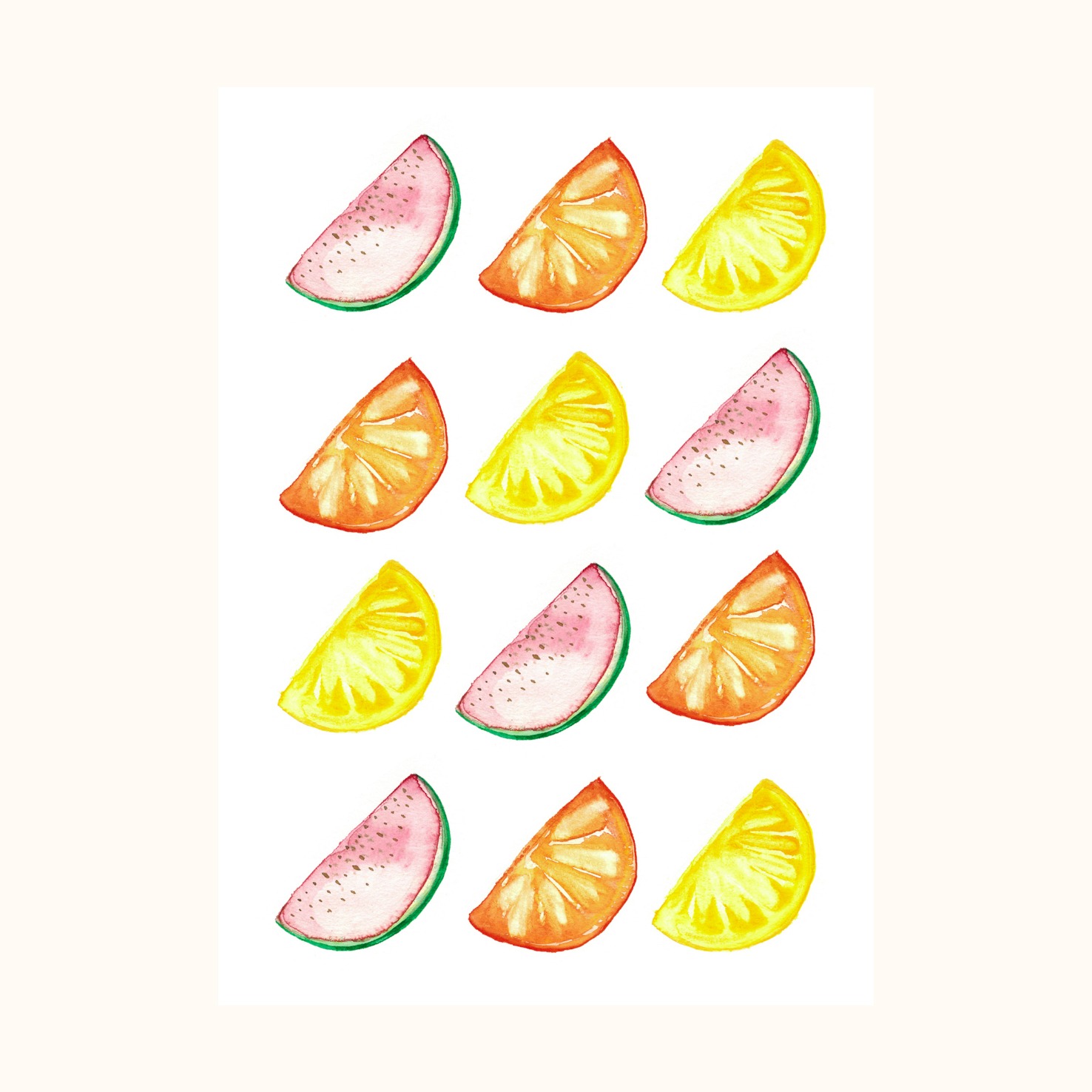 Kort med Frukt. Et forfriskende kort med deilig appelsin. sitron og vannmelon. Passer til bursdagskort, en frisk oppmerksomhet bare fordi, eller det kan rammes inn og henges på veggen. Dobbelt kort. Størrelse: A6. Konvolutt følger med. Kort med Frukt er trykket på matt papir av høy kvalitet.