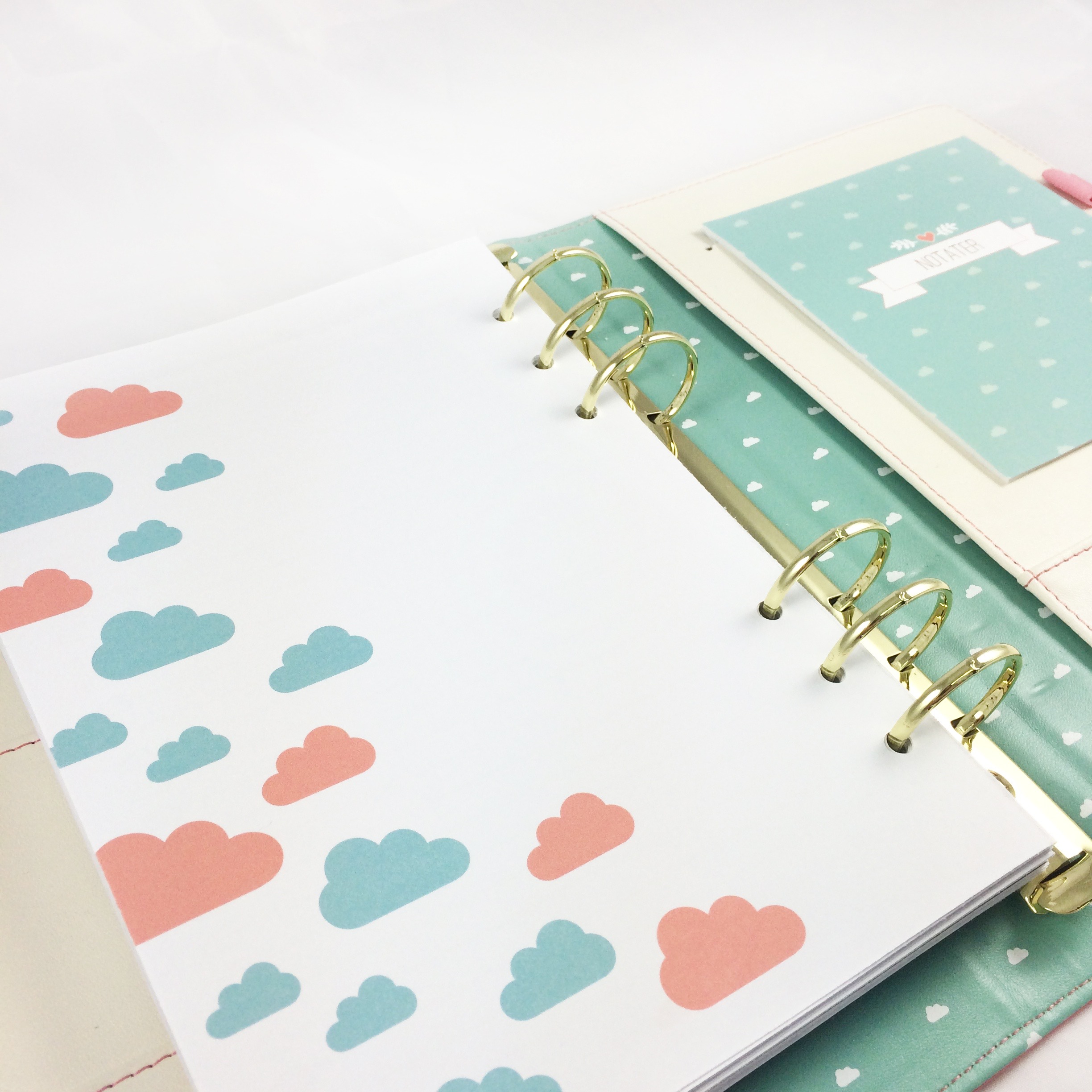 Almanakk til din planlegging. Denne planleggeren og kalenderen er perfekt å bruke for å holde styr på alle avtalene dine og to-dolister. Morsomt å dekorere med klistremerker, washitape og annet om du har lyst. Planleggeren kommer uten kalenderinnmat, og de gullfargede ringene passer til A-plan og filofax A5 størrelse. Farge: Rosa/korall på utsiden med turkis/krem skymønstret innside.