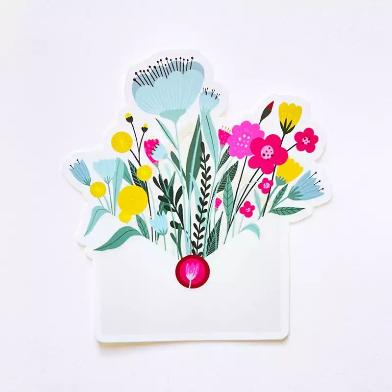 Blomster i konvolutt Klistremerke. Koselig klistremerke med blomstermotiv. Dette klistremerket lages av slitesterk vinyl som beskytter mot riper, vann og sollys, og sikrer at det holder seg pent over tid. Blomster i konvolutt Klistremerke er enkelt å feste og tåler daglig bruk uten å miste kvaliteten.