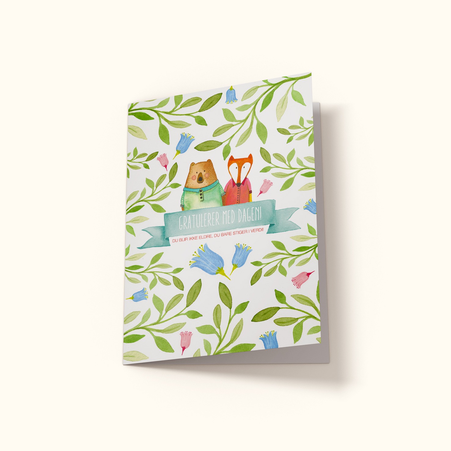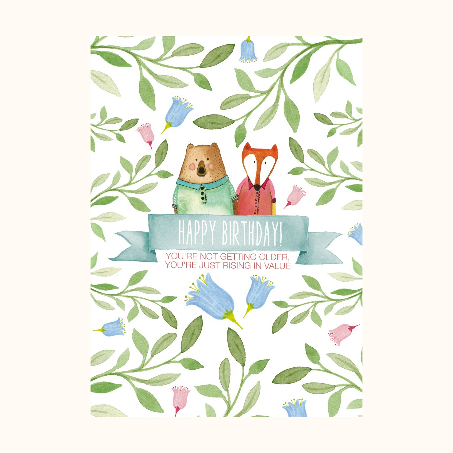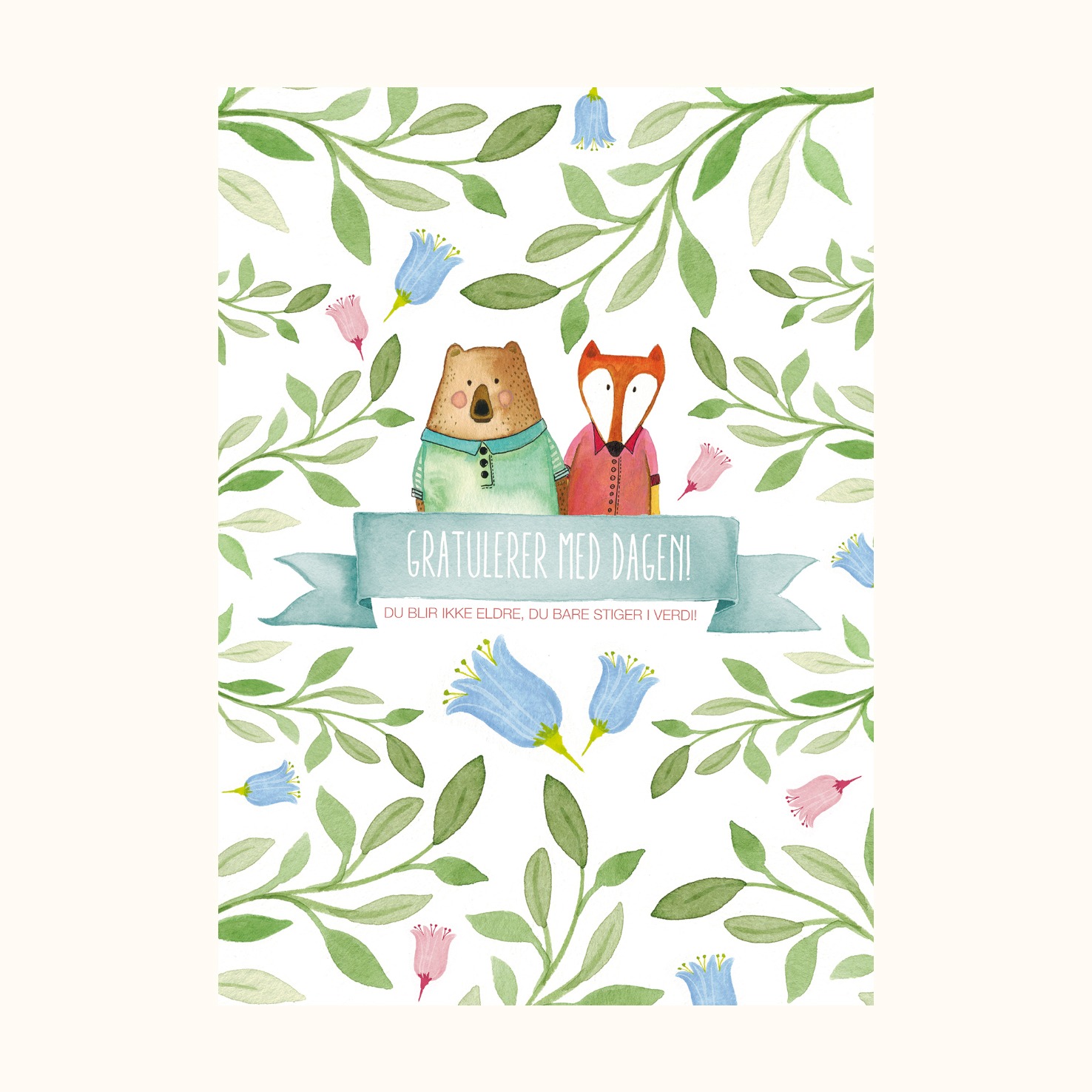 Bursdagskort med dyr – rev og bjørn. Et koselig og søtt bursdagskort med illustrasjoner av en lur rev og søt bjørn. Velg mellom engelsk og norsk tekst: Happy Birthday, you’re not getting older, you’re just rising in value | Gratulerer med dagen, du blir ikke eldre, du bare stiger i verdi. Dobbelt kort. Størrelse: A6. Konvolutt følger med kortet Bursdagskort med dyr – rev og bjørn.