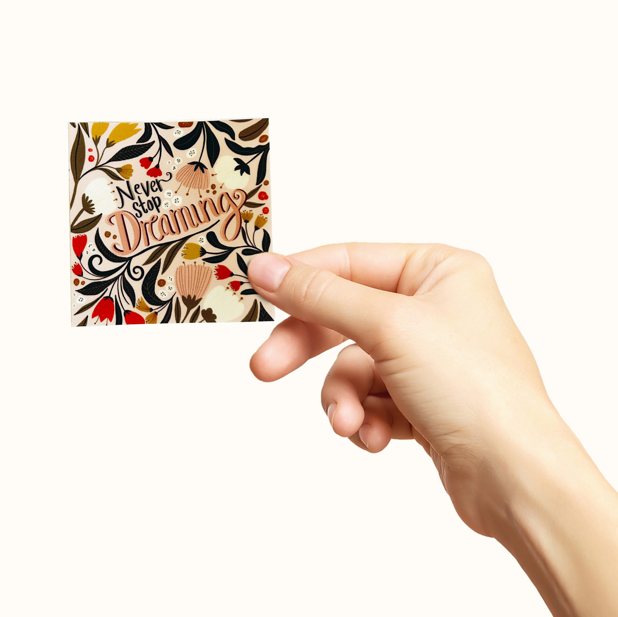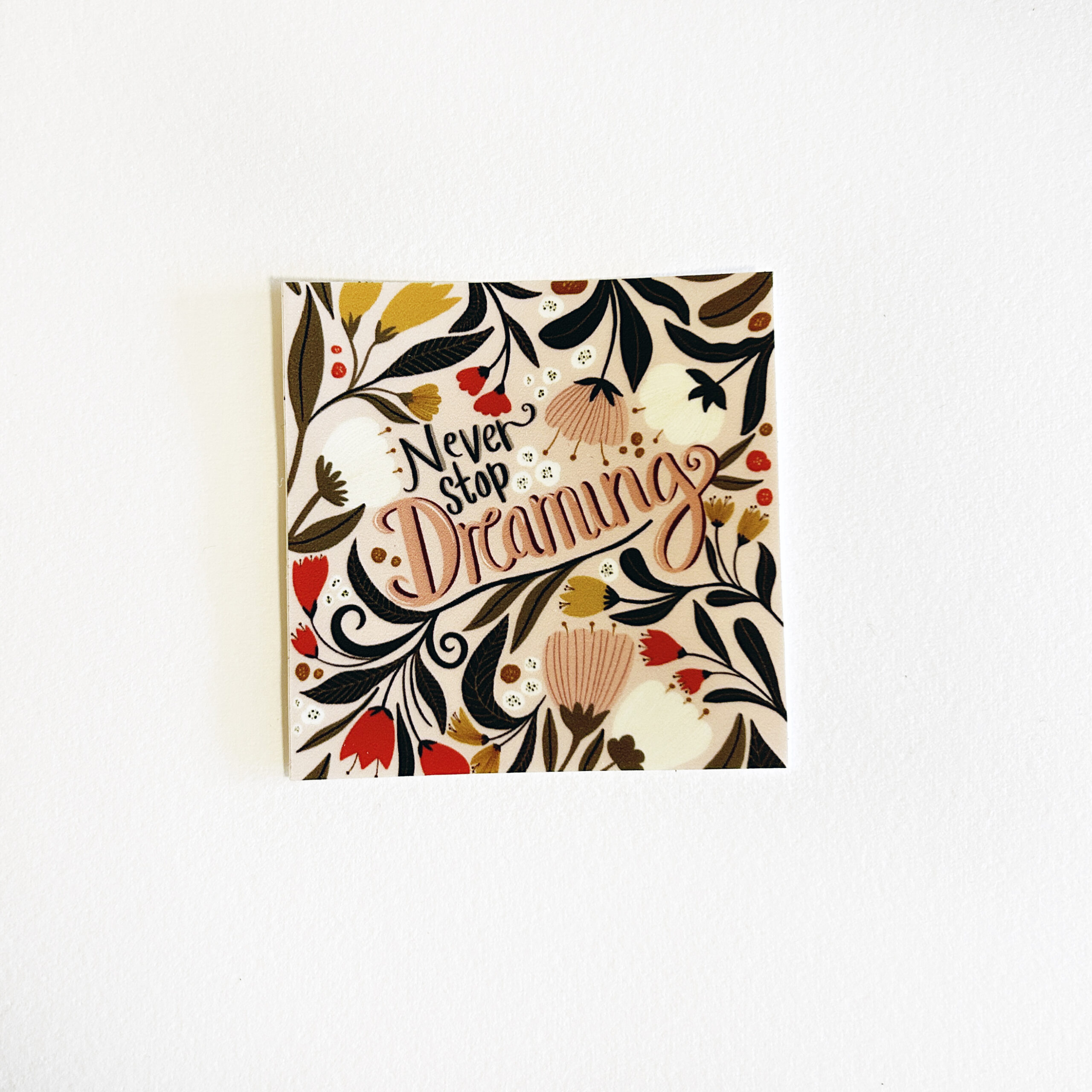 Dekorer med mening! Dette kvadratiske klistremerket i slitesterk vinyl har et fargerikt og dekorativt design med teksten «Never stop dreaming» i midten. Perfekt for deg som vil sette et personlig preg på laptop, vannflaske, notatbok, mobil eller kaffekoppen.