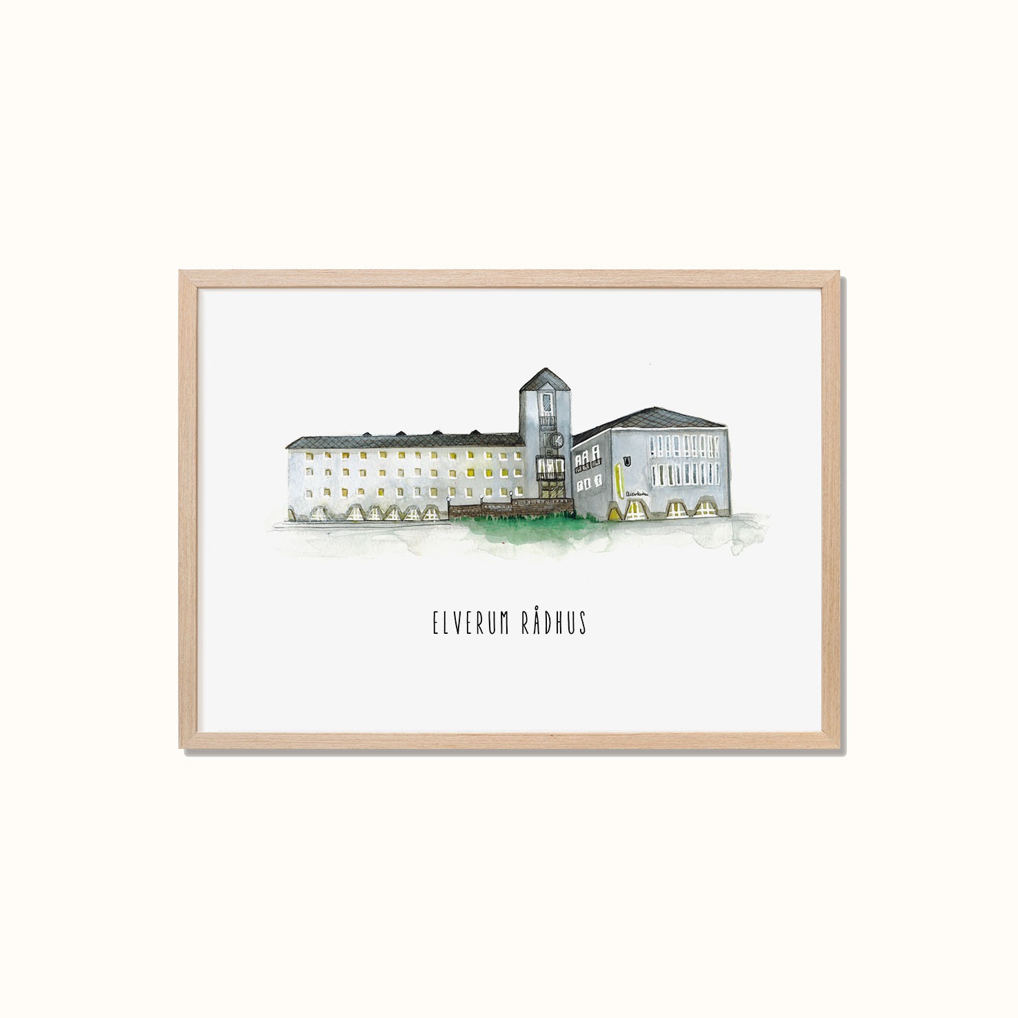 Elverumsplakat – Elverum rådhus. Gi hjemmet ditt en lokal touch med denne vakre plakaten av Elverum Rådhus. Malt i myke akvarellfarger, fanger motivet det ikoniske bygget som har vært en del av byens hjerte i mange år. Denne plakaten passer perfekt i stue, gang eller kontor for deg som ønsker å ha Elverums historie på veggen. Også perfekt på veggen i offentlige bygg i Elverum kommune. Kombiner den med andre bymotiver for en personlig og unik veggdekorasjon, eller gi den i gave til noen med tilknytning til elelr ansatte i Elverum kommunes administrasjon.