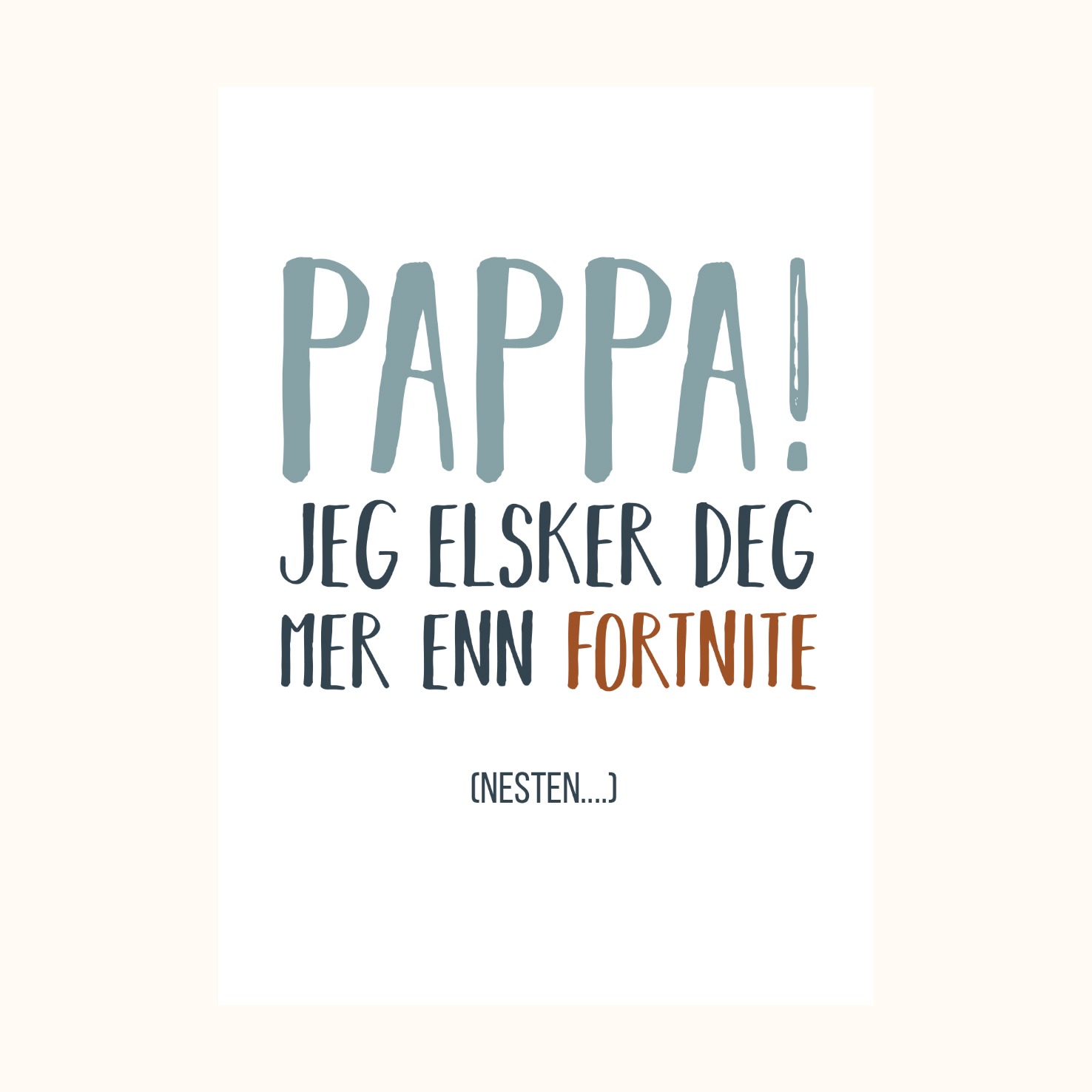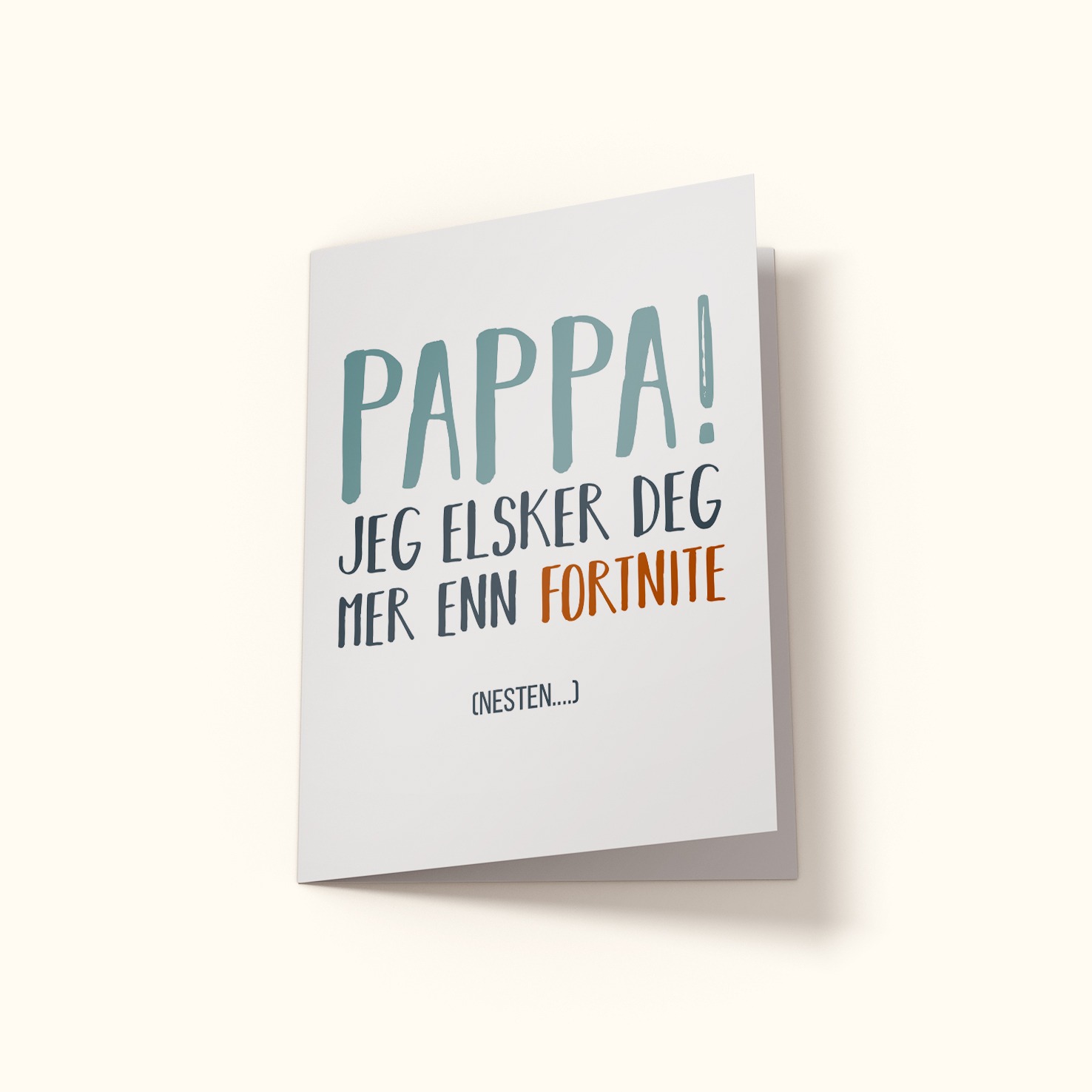 Farsdags kort Fortnite. Et morsomt farsdagskort med teksten: pappa jeg elsker deg mer enn fortnite (nesten). Perfekt å gi til pappa på farsdagen. Dobbelt kort. Størrelse: A6. Konvolutt følger med. Kortet inngår i en serie med morsomme farsdagskort. Farsdags kort Fortnite trykkes på kvalitetspapir.
