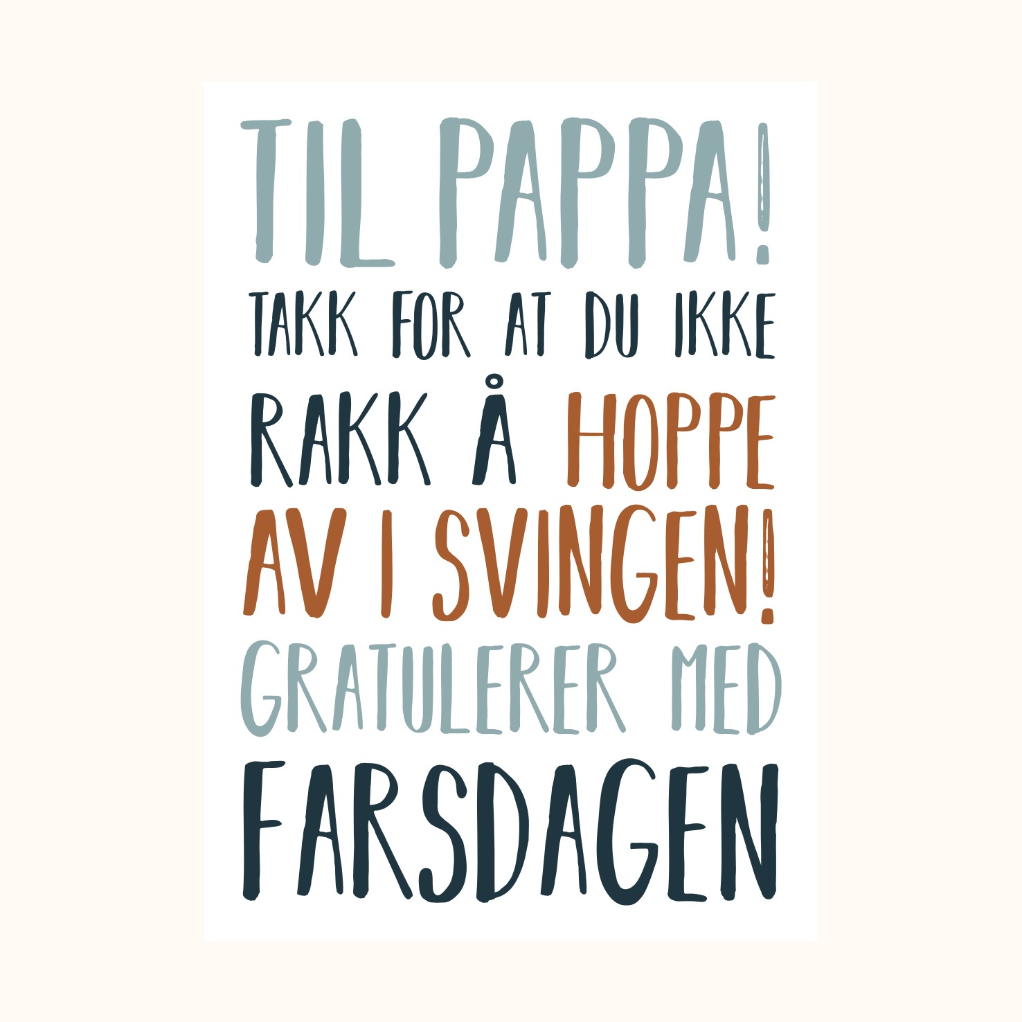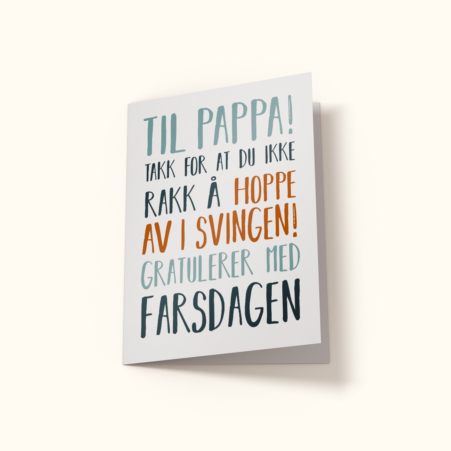 Farsdags kort Hoppe av i svingen. Et humoristisk farsdagskort med teksten: Til pappa! Takk for at du ikke rakk å hoppe av i svingen! Gratulerer med farsdagen! Dobbelt kort. Størrelse: A6. Konvolutt følger med. Kortet inngår i en serie med morsomme farsdagskort. Farsdags kort Hoppe av i svingen trykkes på kvalitetspapir.