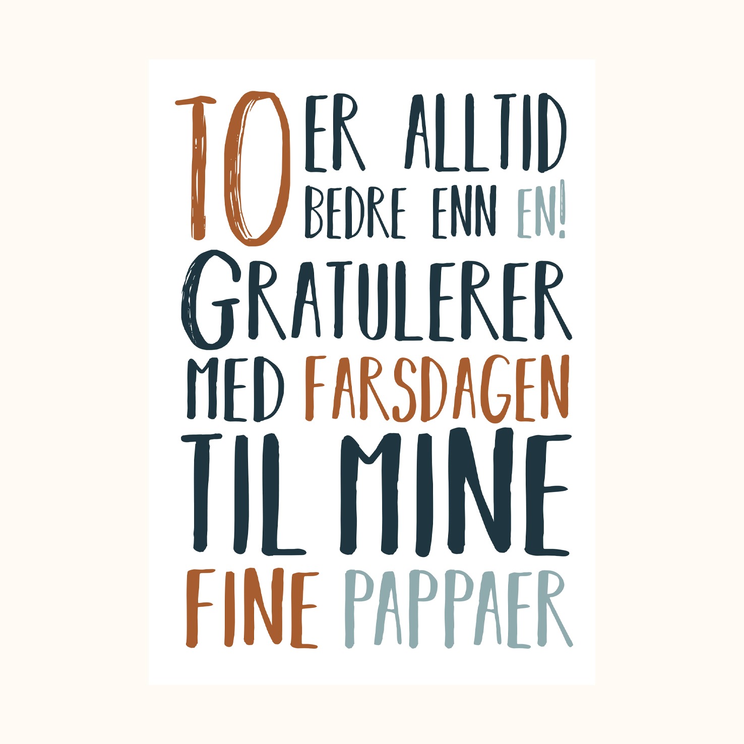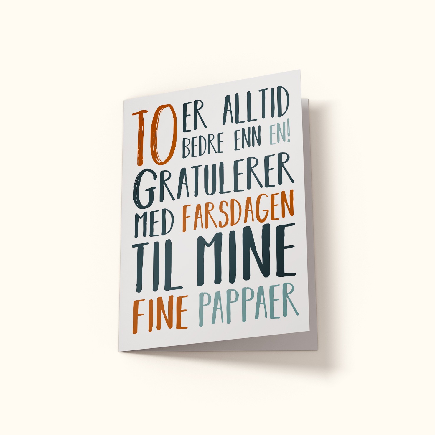 Farsdags kort To er bedre enn en. Et koselig farsdagskort til alle med to pappaer: To er alltid bedre enn en! Gratulerer med farsdagen til mine fine pappaer! Størrelse: A6. Konvolutt følger med. Kortet inngår i en serie med morsomme farsdagskort. Farsdags kort To er bedre enn en trykkes på kvalitetspapir.