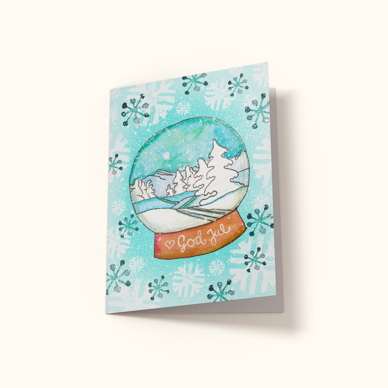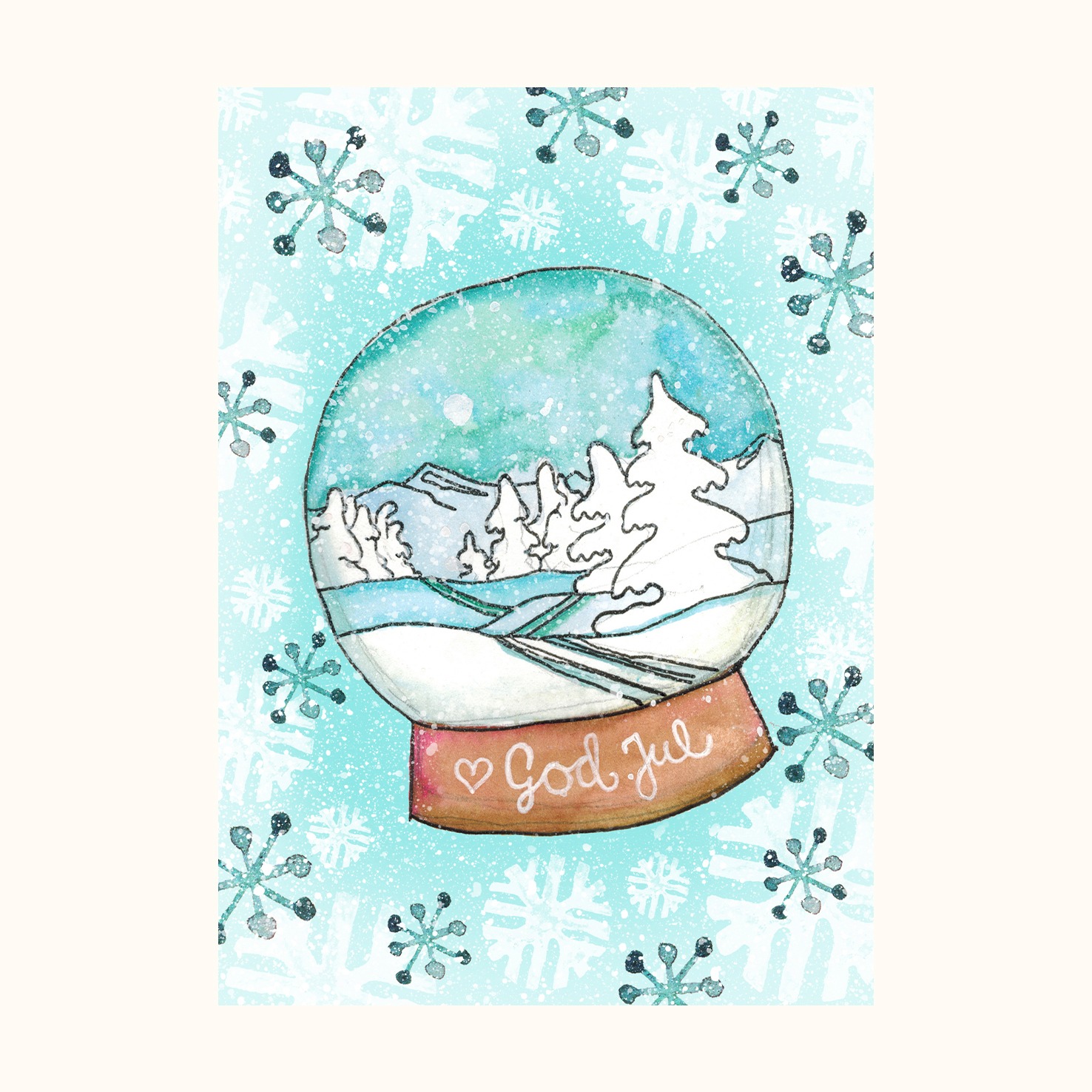 Julekort med vinterlandskap – «Snøkule». Et koselig og sjarmerende Julekort med vinterlandskap i en håndtegnet snøkule som gir følelsen av skandinavisk jul. Passer perfekt å sende som julekort eller som en ekstra oppmerksomhet på julegaven. Tekst: God jul. Dobbelt kort. Størrelse: A6. Konvolutt følger med.