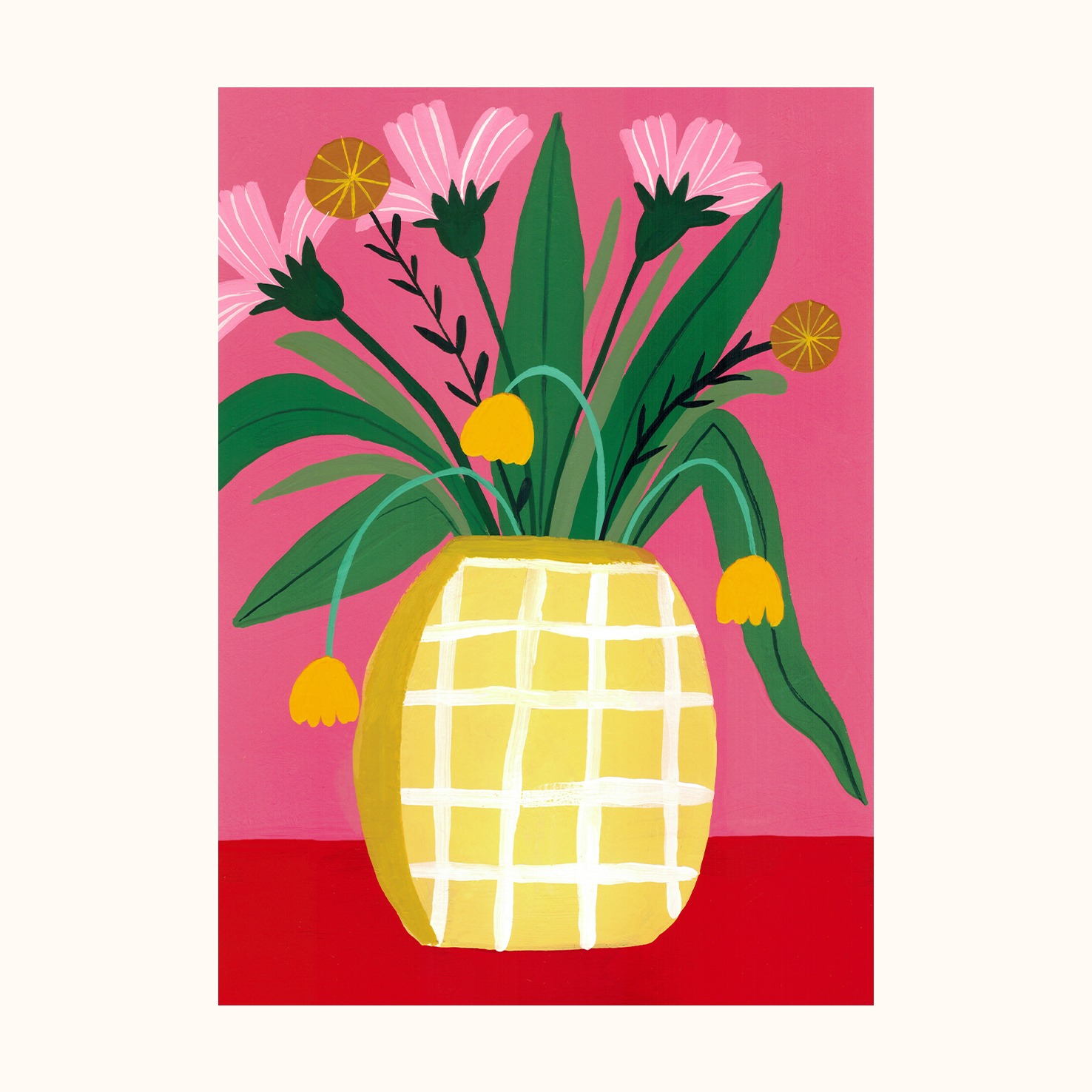 Kunstkort Blomster i vase. Et koselig kort med rosa og gule blomster i en gul rutete vase. Dobbelt kort. Størrelse: A6. Konvolutt følger med. Kunstkort Blomster i vase er trykket på matt papir av høy kvalitet.