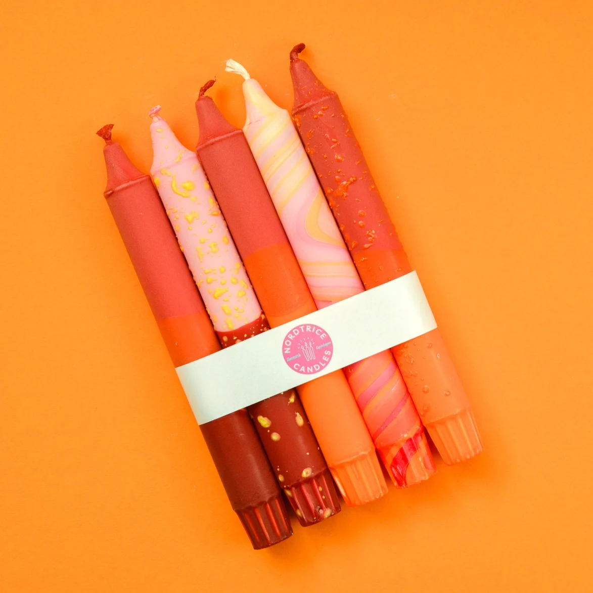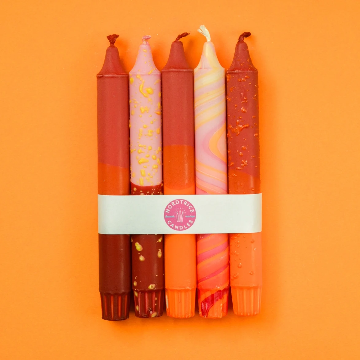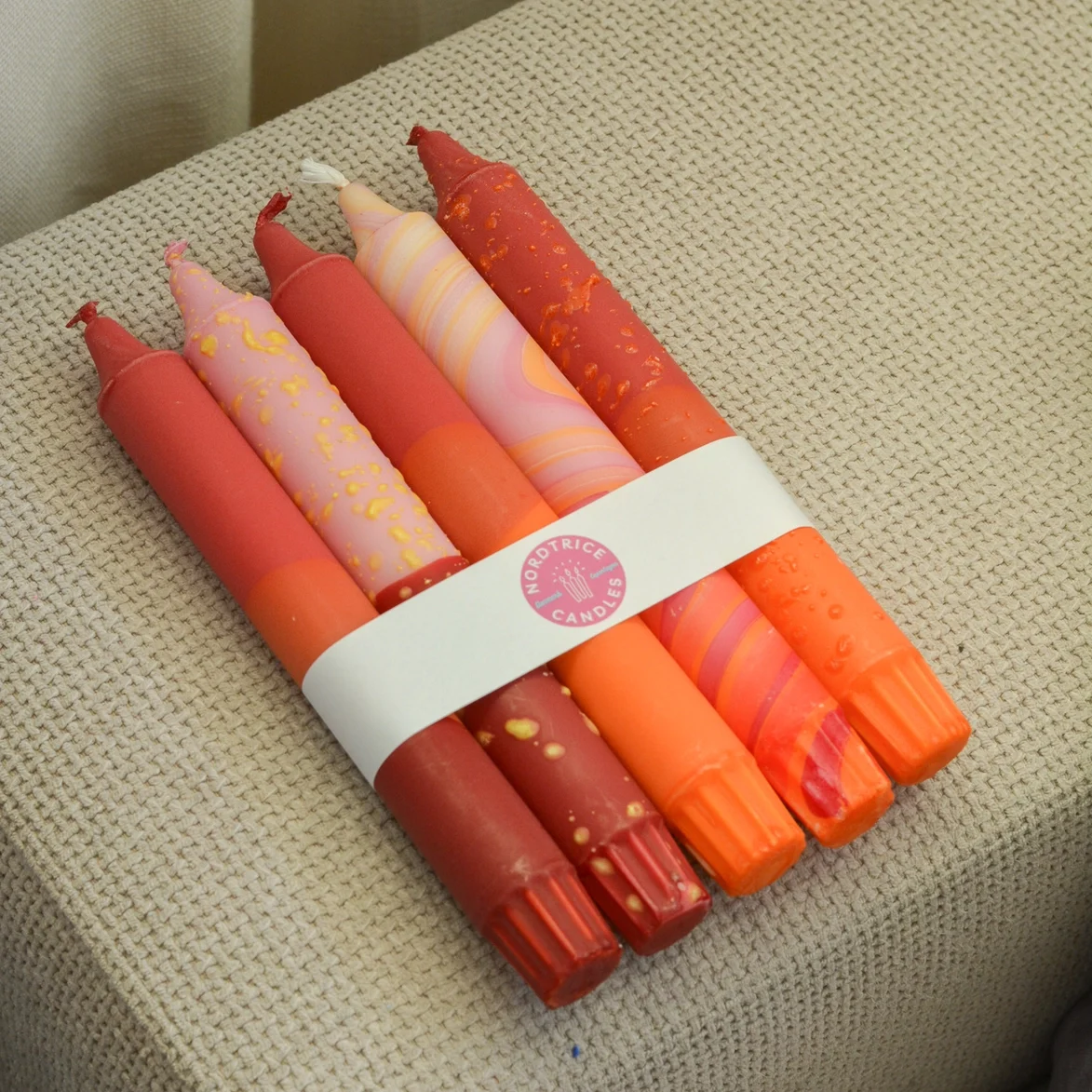 En pakke med fem hånddekorerte lys. Laget og designet med en dypdye-teknikk i skandinavisk stil. Lysene leveres pakket inn i en gavepose. Denne pakken med lys passer perfekt som høstdekorasjon, jule- og festdekorasjon, eller til en koselig kveld hjemme.