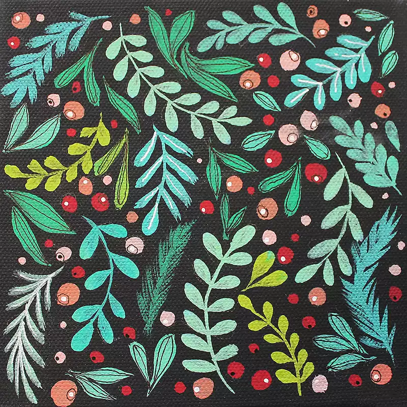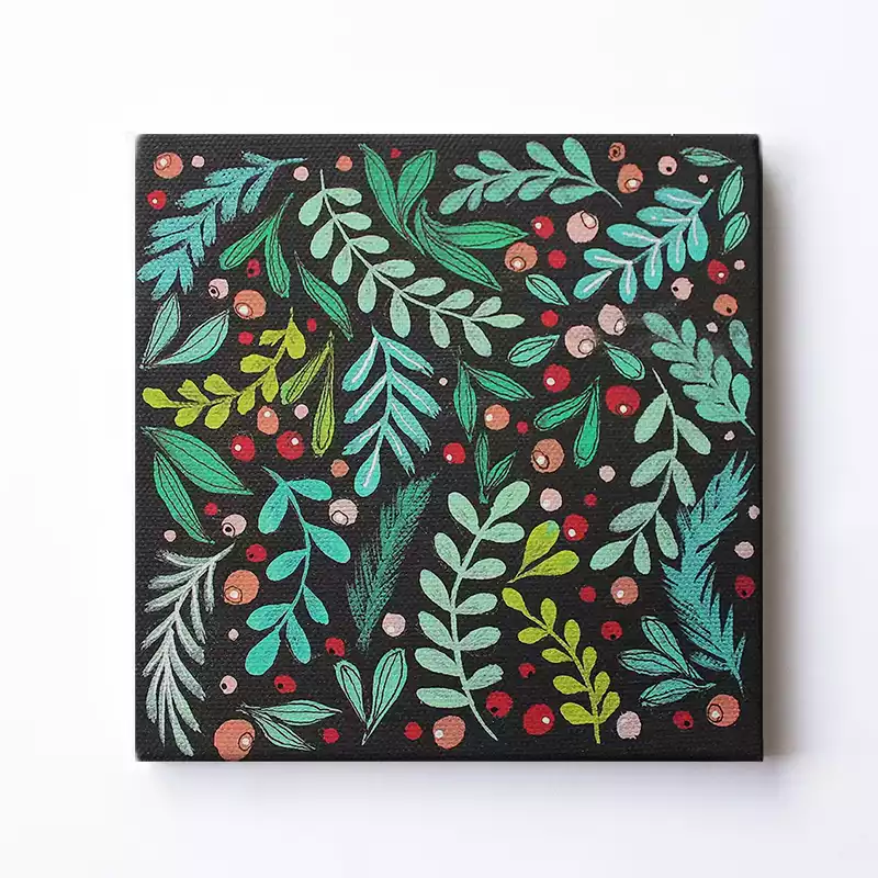Maleri Berries – Mini akrylmaleri med nydelige blader og bær. Maleri Berries malt med akryl på lerret, setter farge på ethvert rom. Koselig liten gave til en du er glad i, eller som en fargeklatt på hjemmekontoret. Å eie original kunst er å investere i noe tidløst. Hvert penselstrøk i dette maleriet unikt, og det finnes kun ett eksemplar.