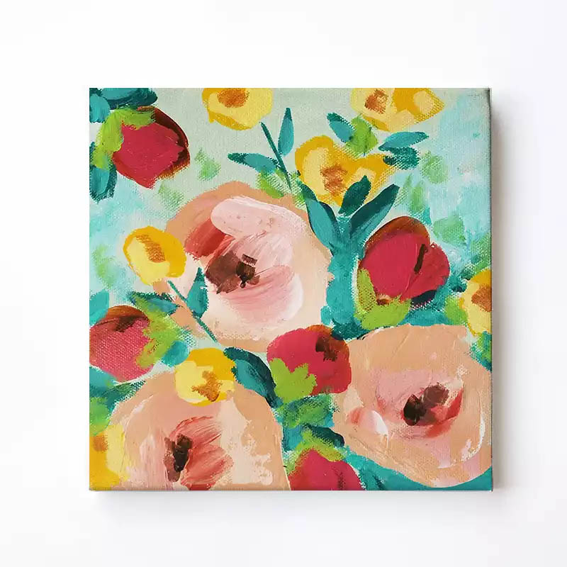 Maleri bundle In Bloom. 2 stk nydelige akrylmalerier med vakre roser på turkis/blå bakgrunn. Maleri bundle In Bloom er malt med akryl på lerret. Maleriene passer perfekt ved siden av hverandre og setter farge på ethvert rom. Koselig gave til noen du er glad i, eller for å sette farge på veggen hjemme. Å eie original kunst er å investere i noe tidløst. Hvert penselstrøk i disse maleriene er unike, og det finnes kun ett eksemplar av hver.
