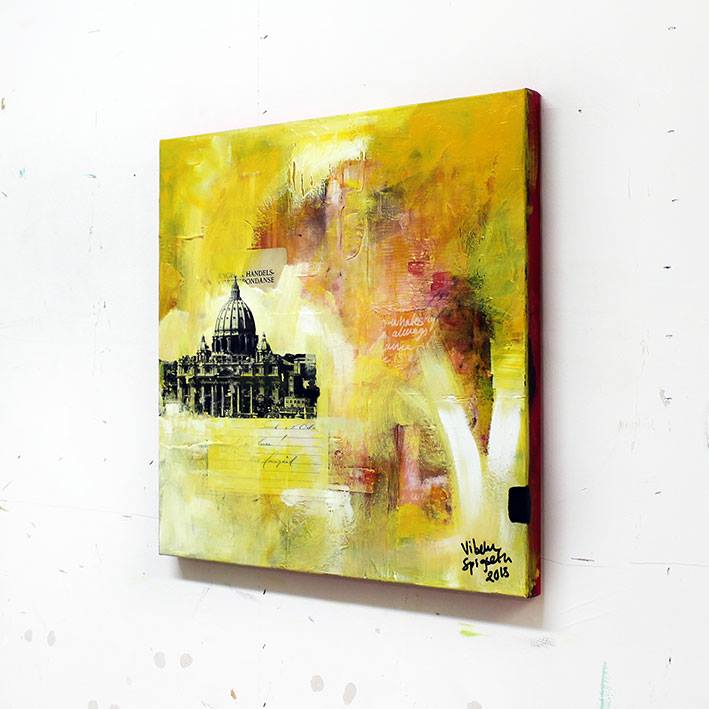 Maleri Den evige stad – Vakkert maleri med motiv fra Roma (St. Peterskirken). Collage/akryl på lerret. Original kunst gir rommet en helt egen atmosfære. Maleri Den evige stad er malt med omtanke og kjærlighet, og er en unik mulighet til å fylle hjemmet ditt med kreativitet og personlighet, samtidig som du støtter en liten kunstnerbedrift.