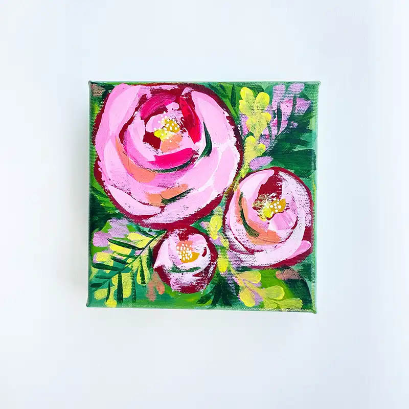 Maleri Pink roses er et minimaleri med nydelige rosa og grønt blomstermotiv. Maleri Pink roses er Malt med akryl på lerret. Koselig liten gave til en du er glad i, eller som en fargeklatt på hjemmekontoret. Perfekt i bildecollager på grunn av den lille størrelsen.