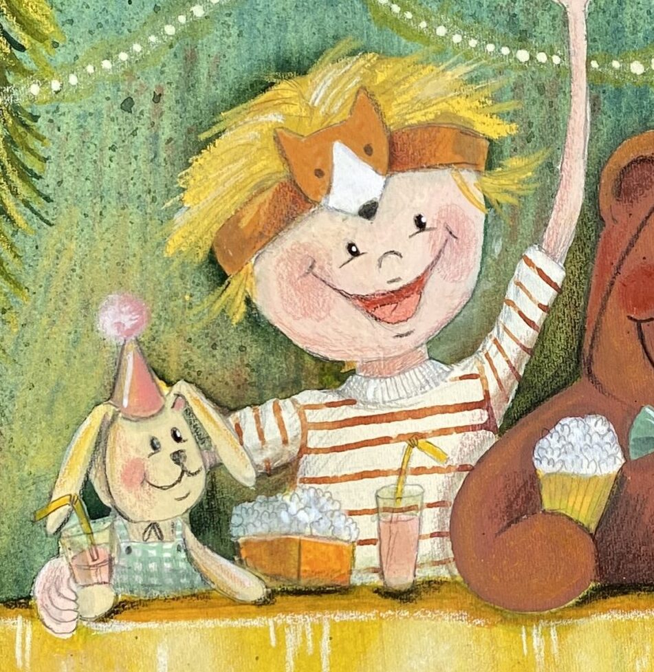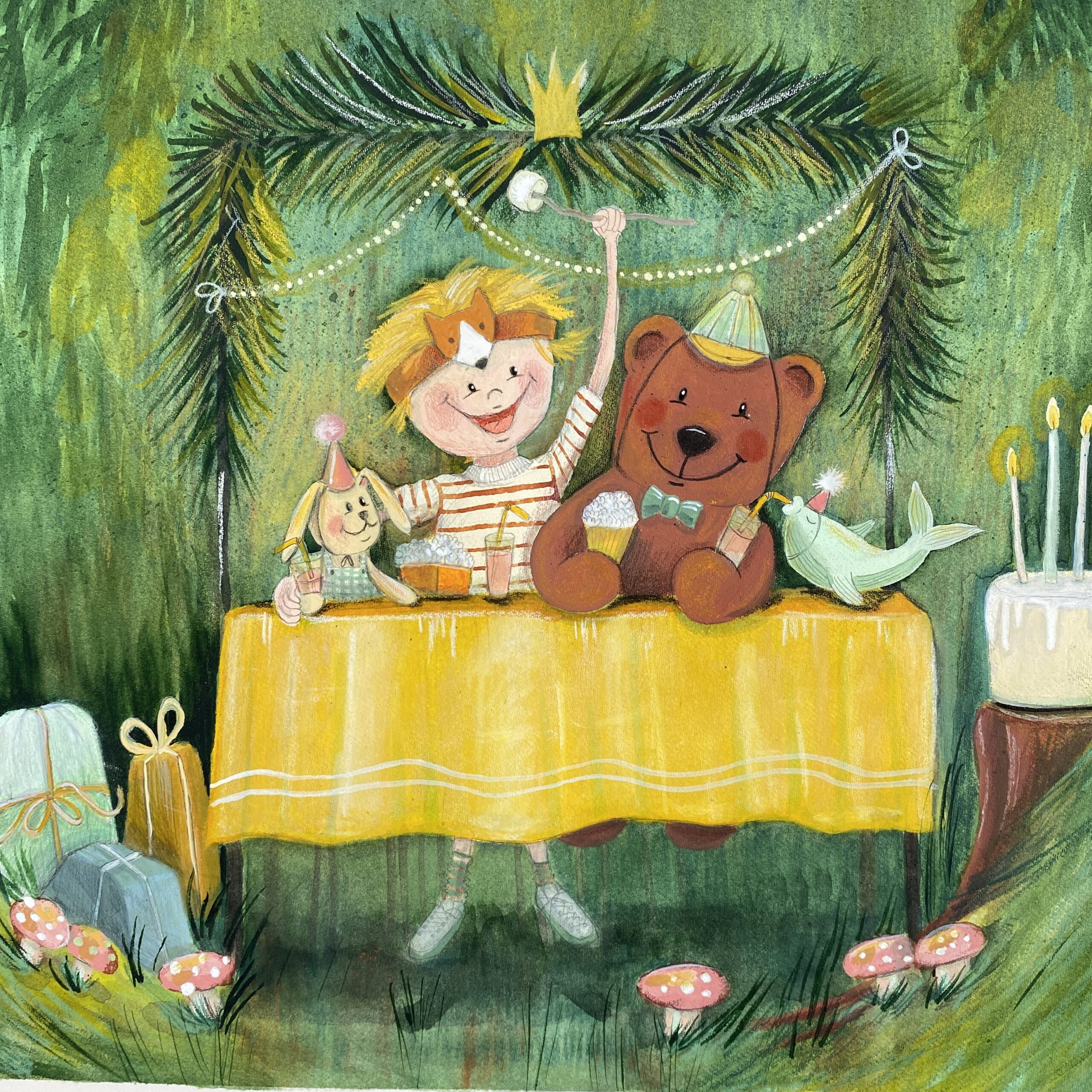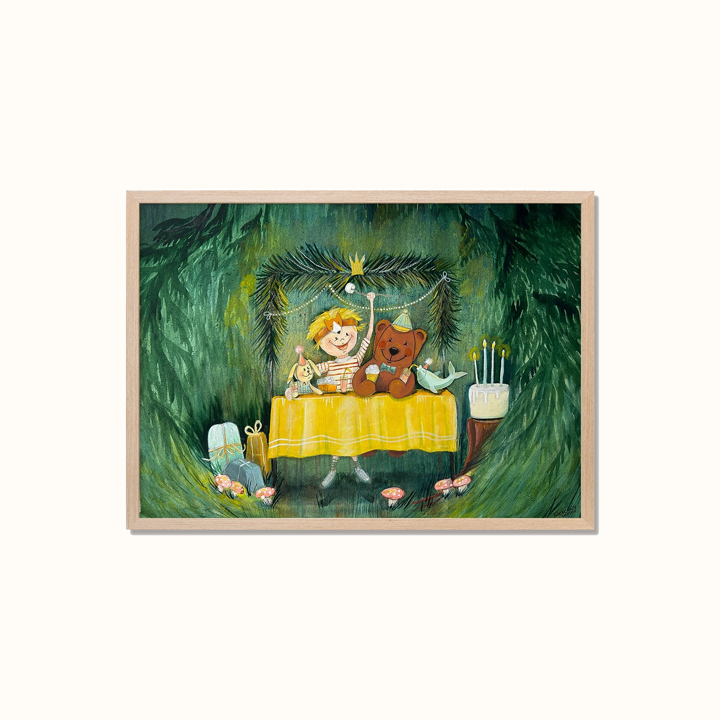 Bursdagsfest – Plakat til barnerommet er en koselig og sjarmerende plakat som viser en liten gutt som feirer bursdagen sin i skogen med alle kosedyrene sine. Perfekt til barnerommet eller til deg som elsker eventyr!