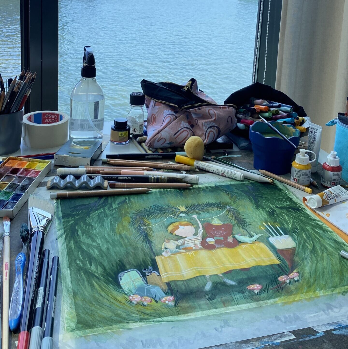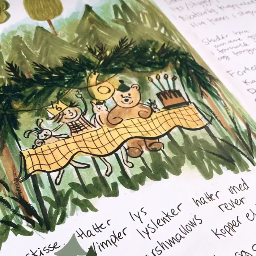 Plakat med illustrasjon av et koselig bursdagsselkap i skogen. Velg mellom ulike størrelser. Ramme er ikke inkludert.