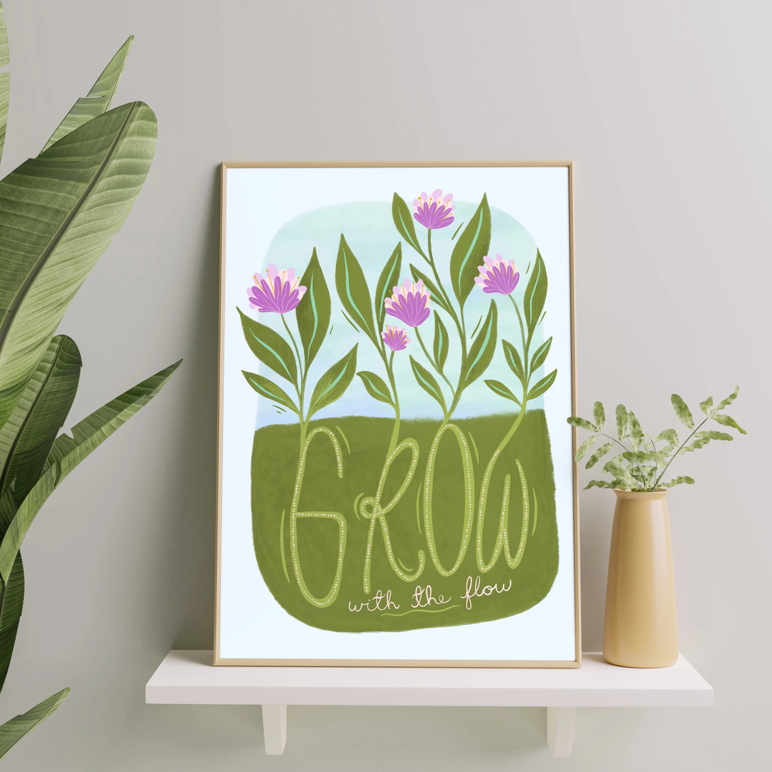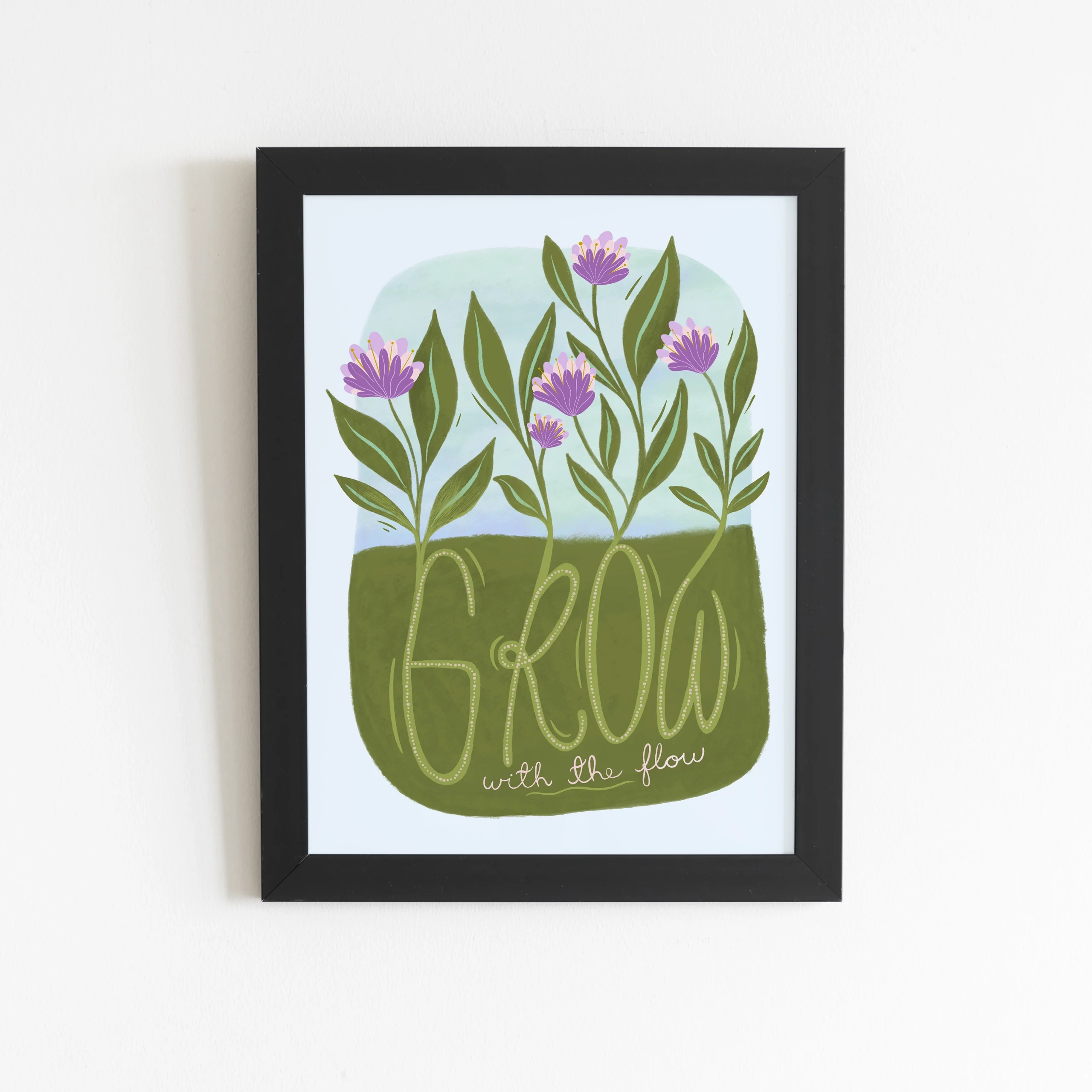 Plakat med tekst – Grow with the flow. Oppmuntre deg selv eller en venn med denne nydelige plakaten! Teksten «Grow with the flow» er håndskrevet. Perfekt for soverommet eller på hjemmekontoret, hvor du trenger litt ekstra inspirasjon. Plakat med tekst – Grow with the flow er trykket på høykvalitetspapir, noe som gir en klar og skarp gjengivelse av illustrasjonen.