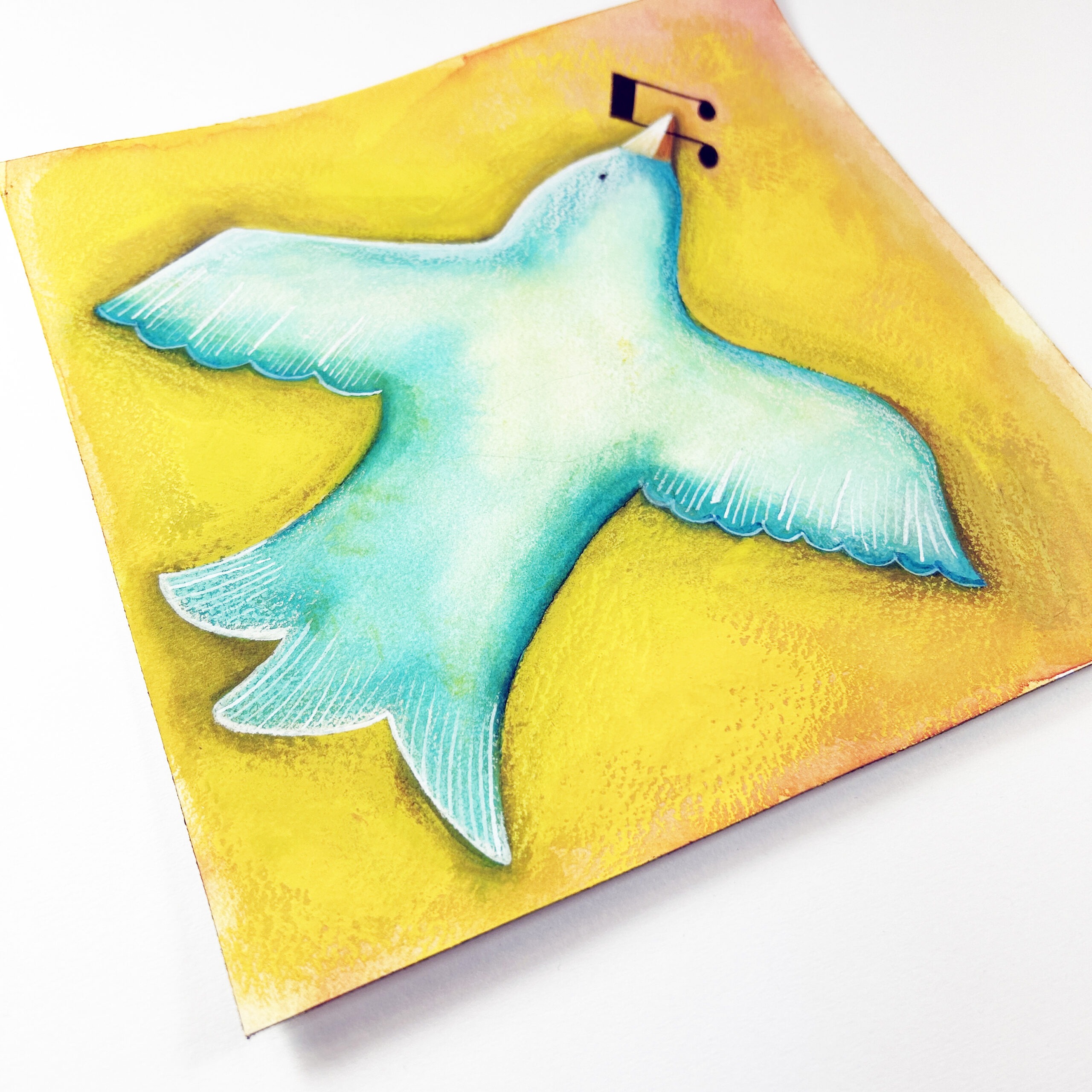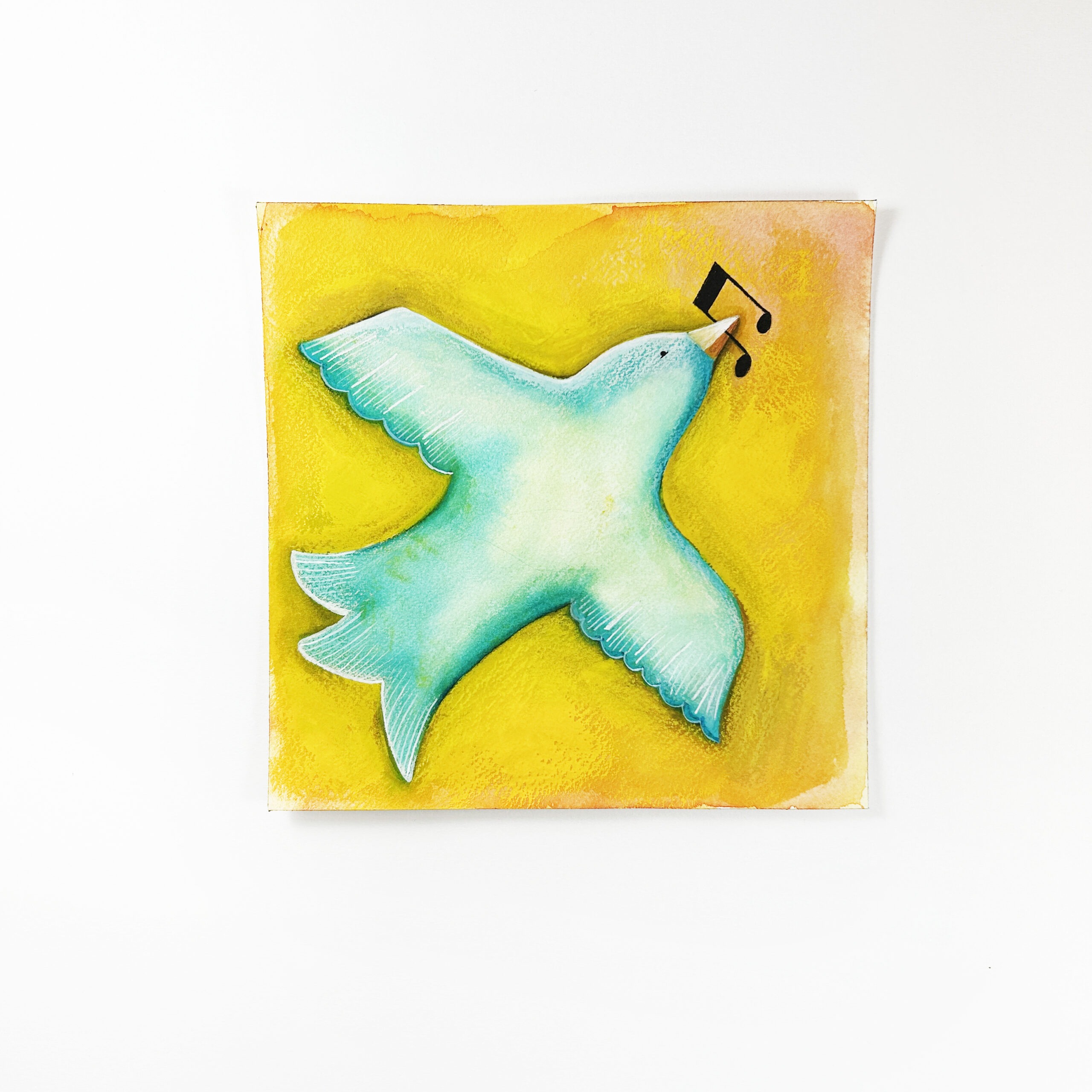 Sangfugl – original malt på papir, er et koselig maleri med en blå sangfugl på gul bakgrunn. Dette er et unikt kunstverk malt med gouache og luminance fargeblyanter, og det finnes kun ett eksemplar. Maleriet er malt med kvalitetsmaling for å sikre lang holdbarhet og flotte farger. Sangfugl – original malt på papir er et koselig bilde som passer godt i de fleste hjem, eller som en spesiell gave til jubileum, bryllup eller andre anledninger. Maleriet er malt på akvarellpapir av høy kvalitet som gir det en vakker tekstur og overflate.