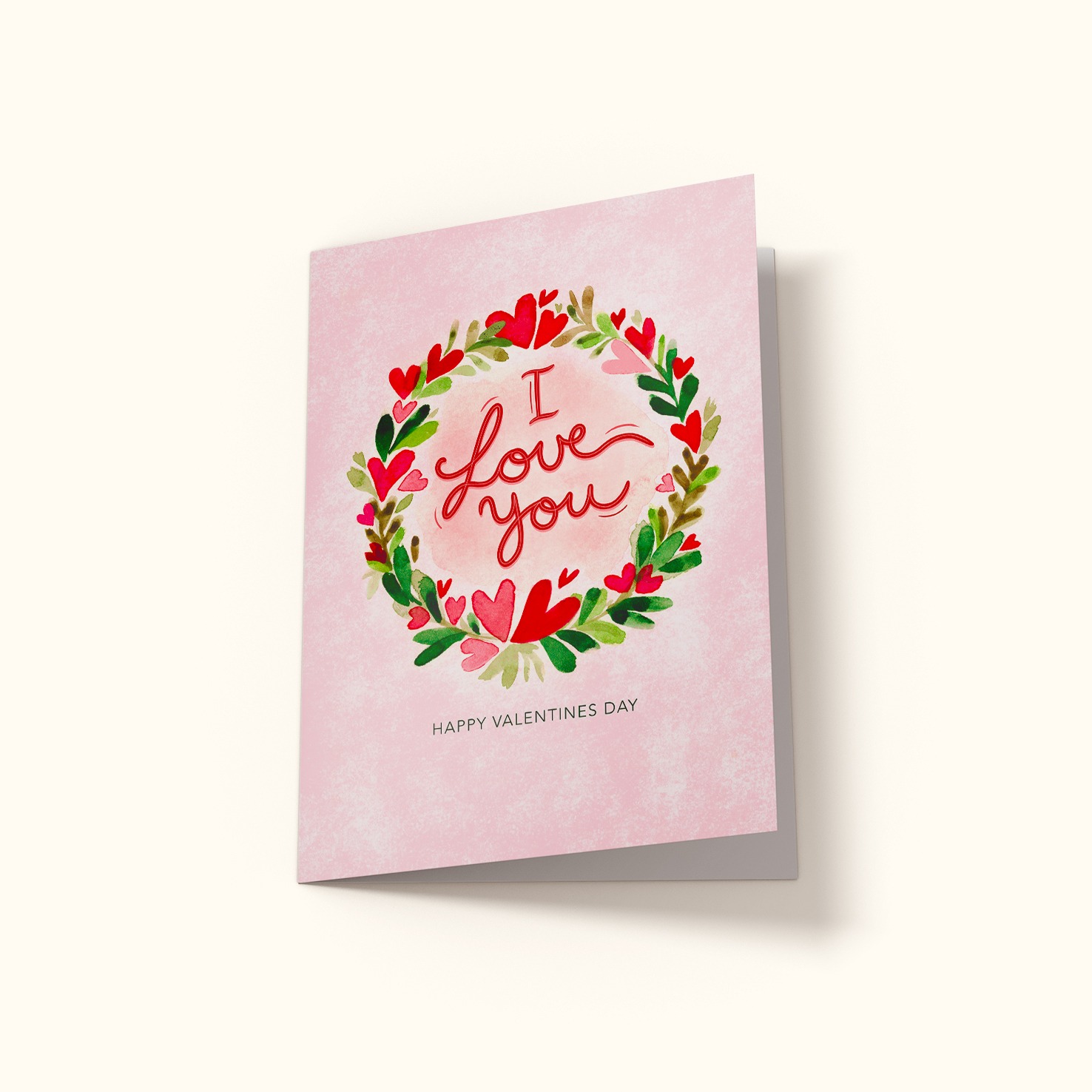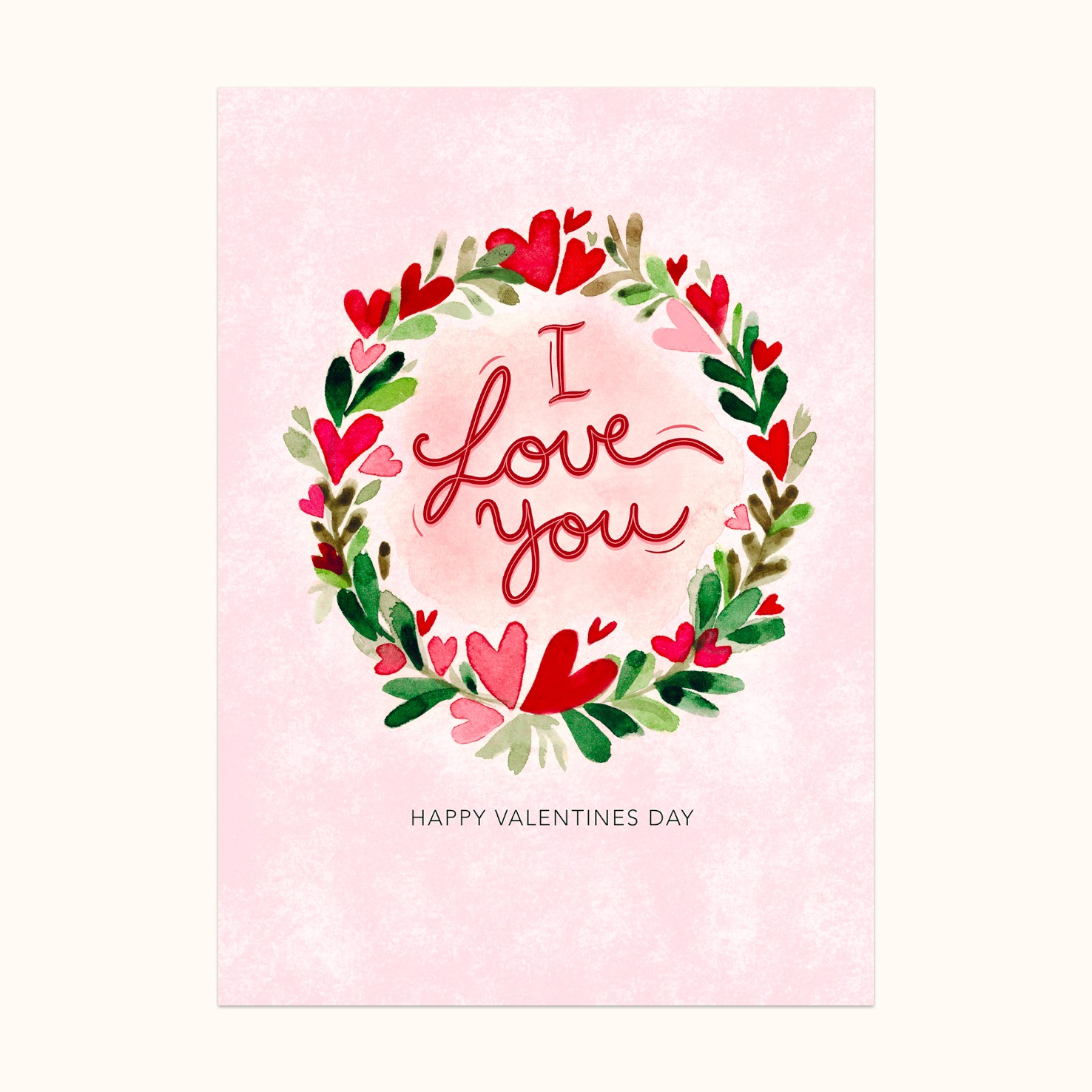 Valentineskort – I love you. Et søtt og koselig Valentineskort med en vakker illustrasjon av en krans med hjerter og teksten I love you, happy valentines day. Dette valentineskortet er perfekt å gi til din kjære på valentines day for å vise hvor glad du er i personen. Dobbelt kort. Størrelse: A6. Konvolutt følger med. Valentinekort trykkes på papir av høy kvalitet.